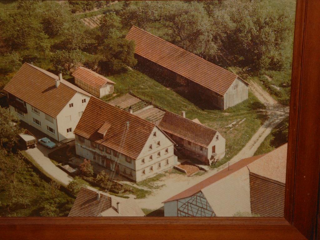 Schnapsbrennerei (Mitte), Backhaus (rechts hinter altem Wohnhaus), Stall mit großem alten Gewölbekeller (unten rechts), Scheune (oben rechts) und Hühnerstall (hinter neuem Wohnhaus), eine Garagenscheune ist auf diesem